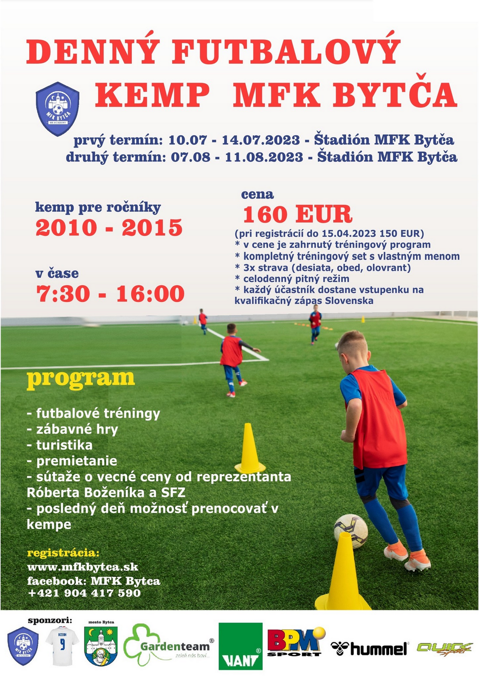 MFK Bytča pozýva na letný futbalový kemp, ktorý sa uskutoční v dvoch termínoch a to 10. 7. 2023 až 14. 7.2023 a 7.8 až 11. 8.2023. Tešíme sa na vás!